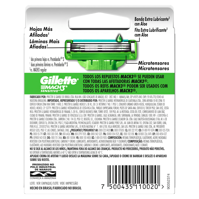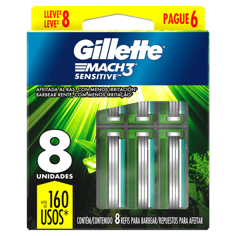 "Além das características da família Mach3 nas quais você já confia, a lâmina de barbear Mach3 Sensitive oferece uma fita lubrificante avançada* com a Tecnologia Skin Protect que protege contra irritação, mesmo em pele sensível. Para melhor performance, use em um aparelho Mach3 Sensitive.