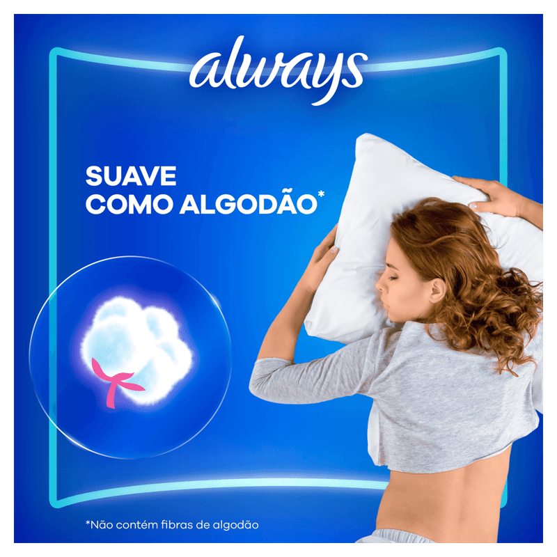 Durma tranquilamente durante o seu período menstrual com o Absorvente Always Noites Tranquilas Suave Extra Grande, com abas e cobertura suave tamanho XG de 31cm. Suave como algodão que se ajusta a sua calcinha para maior conforto.