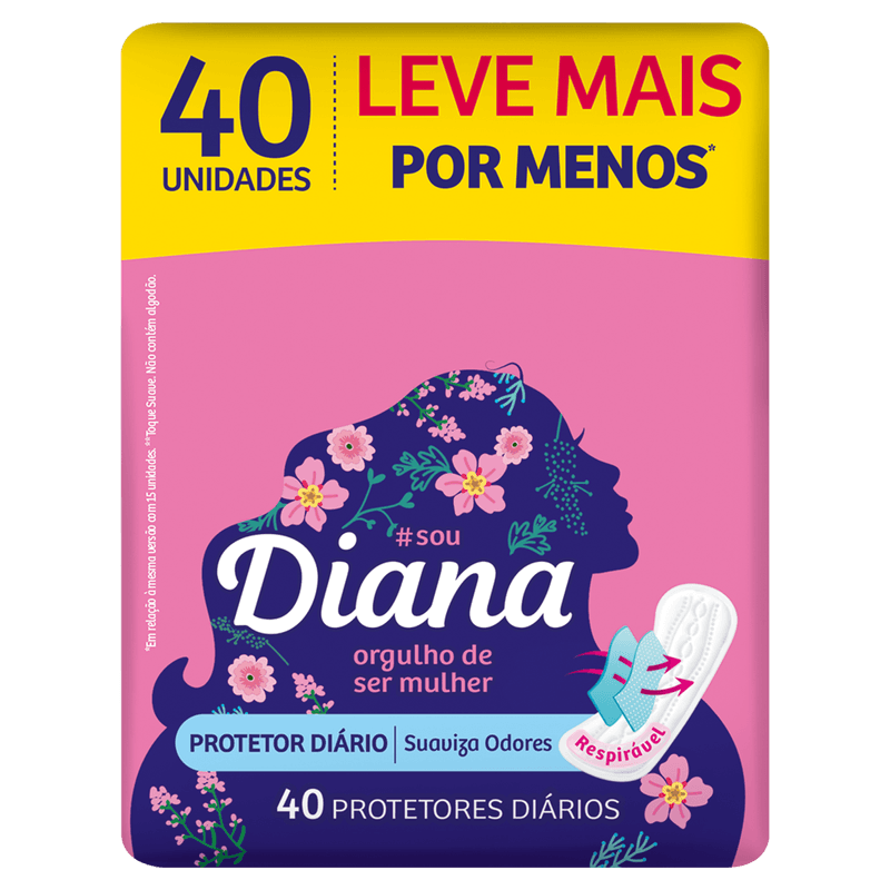 Um protetor diário sem fragrância, ideal para ser usado no finalzinho da menstruação ou mesmo quando não se está naqueles dias. Produzido com microporos e material respirável, Protetor Diário Diana absorve a transpiração e neutraliza possíveis odores.