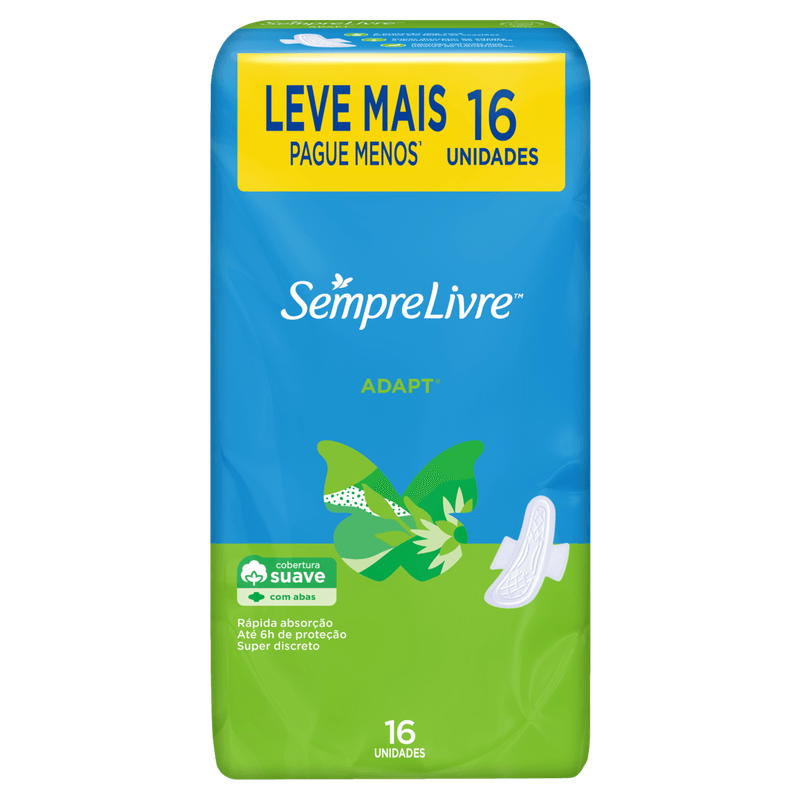 O Absorvente Adapt com Abas Sempre Livre é um absorvente externo com cobertura suave, disponível em embalagem com 16 unidades. Desenvolvido para oferecer proteção e conforto durante o fluxo menstrual, possui abas que garantem melhor fixação e agentes naturais que ajudam a neutralizar odores.
