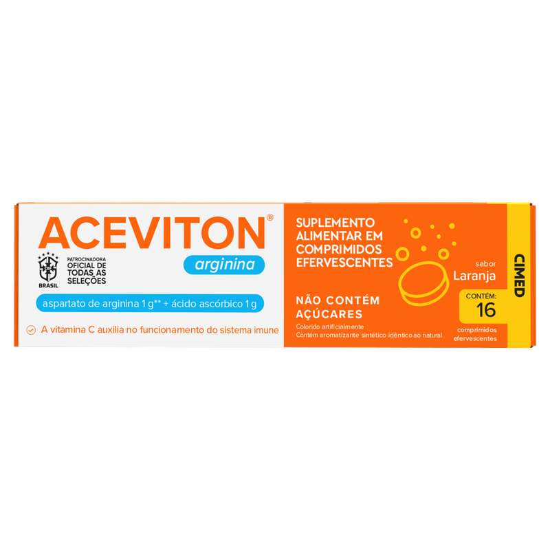 Cada comprimido efervescente contém 1g de ácido ascórbico e 1g de aspartato de arginina, sem adição de açúcares. Apresenta textura efervescente, facilitando a ingestão e absorção. A embalagem contém 16 comprimidos, sem necessidade de prescrição médica, e é indicada para adultos que desejam melhorar a imunidade e reduzir a fadiga. Produto sem tarja, de uso oral, fabricado pela Cimed, com sabor agradável de laranja.
