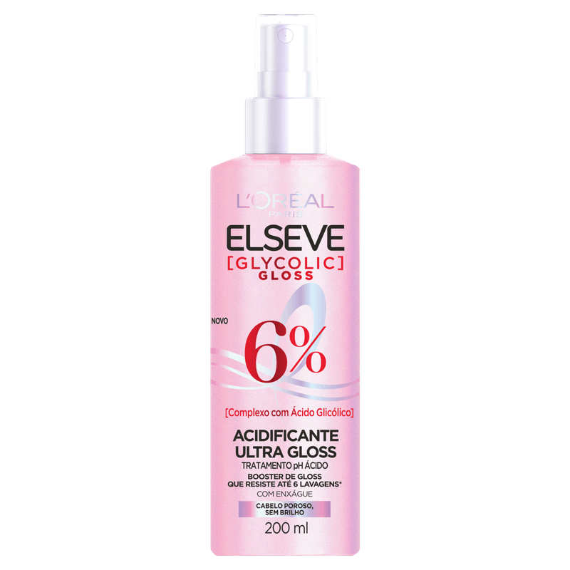 O Acidificante Elseve Glycolic Gloss Spray 200ml L'Oreal é um tratamento ácido inovador que combate a porosidade dos fios desde o primeiro uso, promovendo um brilho gloss intenso e duradouro. Sua fórmula com 6% de Ácido Glicólico e pH ácido lamina as cutículas, corrige as falhas da fibra capilar e impulsiona o gloss no cabelo, deixando os fios visivelmente saudáveis, alinhados e com brilho que resiste por até 6 lavagens.