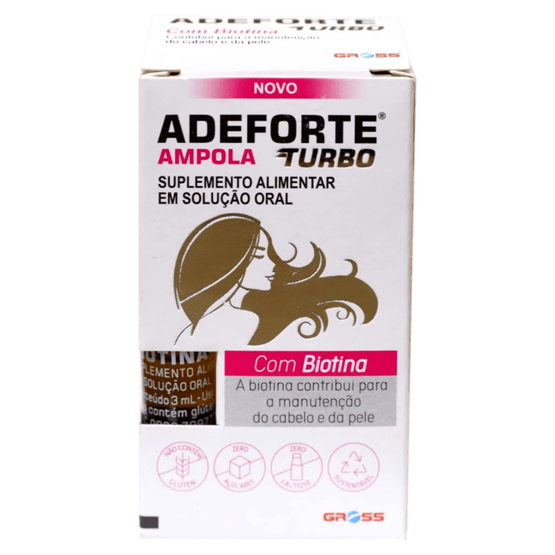 A ação esperada do Adeforte Turbo é o suporte à saúde da pele e cabelos, fortalecimento dos ossos e proteção celular contra radicais livres. Livre de açúcar, lactose e glúten, o produto apresenta ampolas hermeticamente lacradas para maior segurança e conservação. Sua textura líquida facilita o consumo e a absorção dos nutrientes. Com capacidade de 3 ml por ampola, é uma opção prática para quem busca um suplemento vitamínico completo, sem necessidade de prescrição médica.