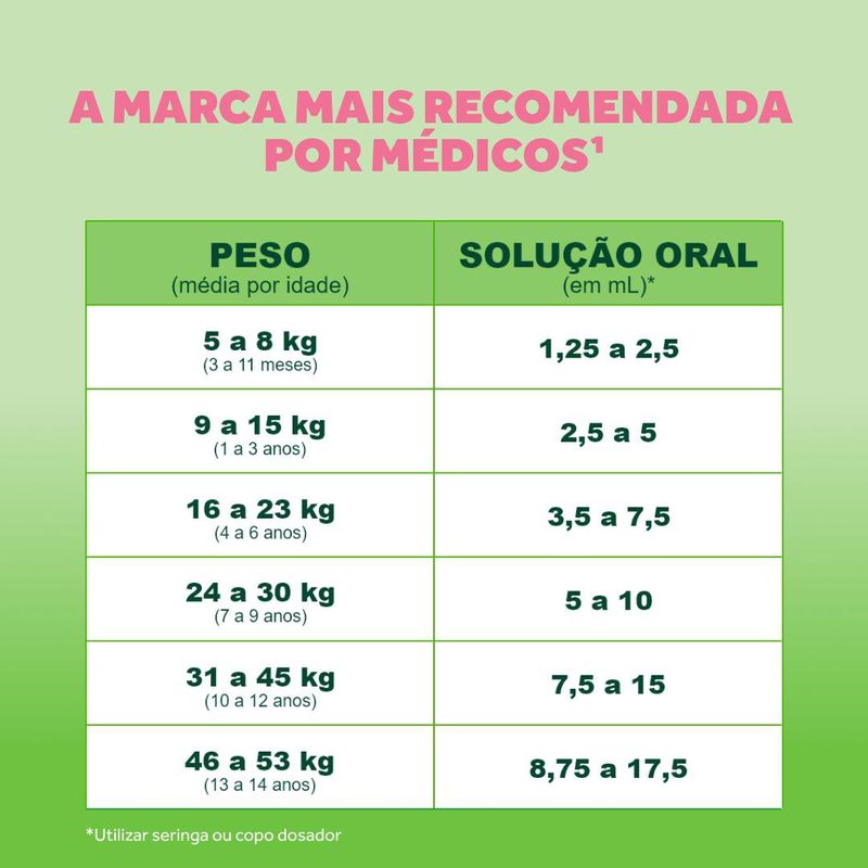 O medicamento deve ser administrado por via oral, utilizando a seringa dosadora que acompanha o produto. A dosagem deve ser ajustada conforme o peso da criança, respeitando os limites máximos diários recomendados. É importante seguir a orientação médica para a posologia correta.