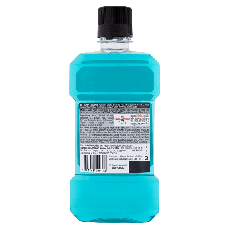O Listerine COOL MINT é um antisséptico bucal que atua contra os germes que causam mau hálito, placa bacteriana e gengivite. Desenvolvido para manter o hálito fresco, quanto utilizado duas vezes ao dia, pela manhã e pela noite após a escovação e fio dental. Promove uma sensação de refrescância, além de auxiliar na obtenção de uma higiene bucal completa. Não administrar o produto a menores de 12 anos, não engolir