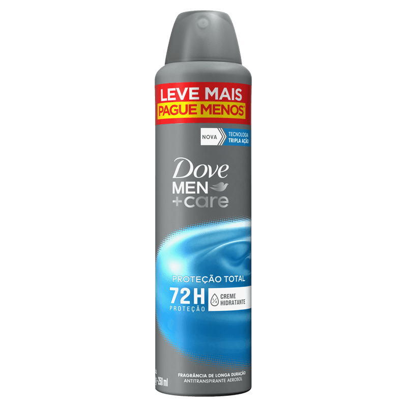 O Dove Men +Care Proteção Total é um desodorante aerossol com tecnologia com ¼ de creme hidratante, que oferece potente ação contra o suor, sem irritar e agredir a pele.
