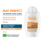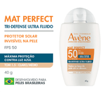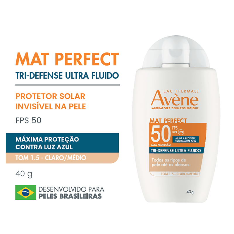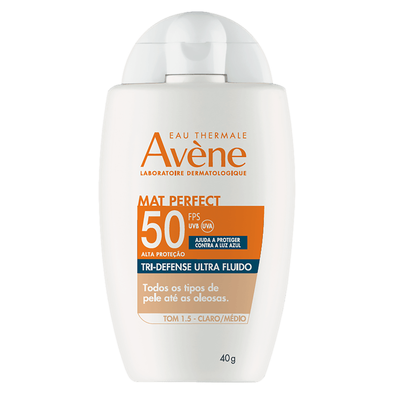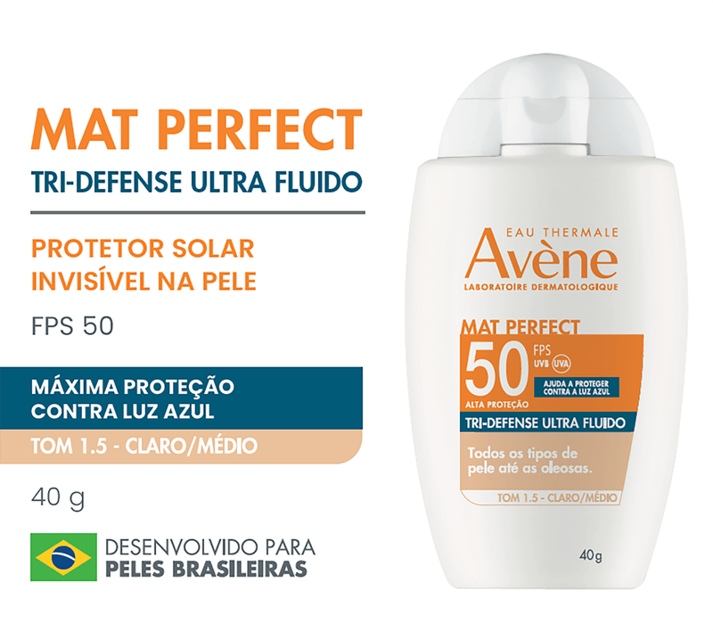Novo Protetor Solar Avène Mat Perfect Tri-Defense Ultra Fluido FPS 50. É um protetor facial com alta proteção para todos os tipos de pele, até as oleosas. É o único no mercado que possui máxima proteção contra os raios UVB, UVA e a luz azul, em um filtro sem cor. Isso graças ao Triasorb, filtro exclusivo e patenteado de Avène, que previne e protege contra danos profundos ao DNA da pele, causados pela luz azul. Seus pigmentos ajudam a uniformizar o tom com uma cobertura natural, perfeita para o dia a dia. Ele tem textura ultra fluida, leve como água, com acabamento invisível na pele e sem textura pegajosa, absorvido imediatamente. Possui efeito matte e sua fórmula é eco-friendly e desenvolvida para preservar a biodiversidade marinha.