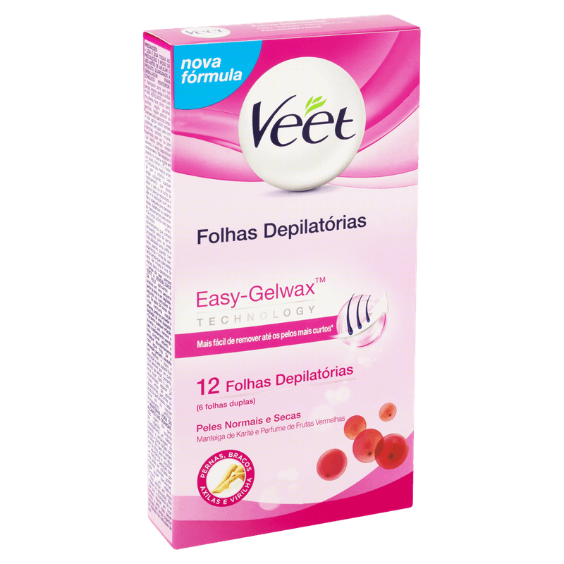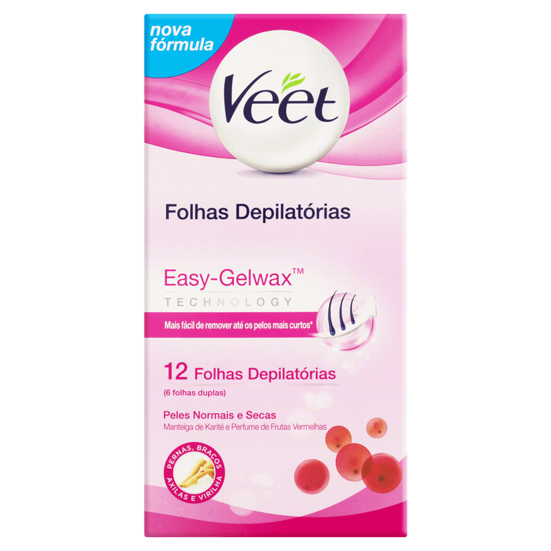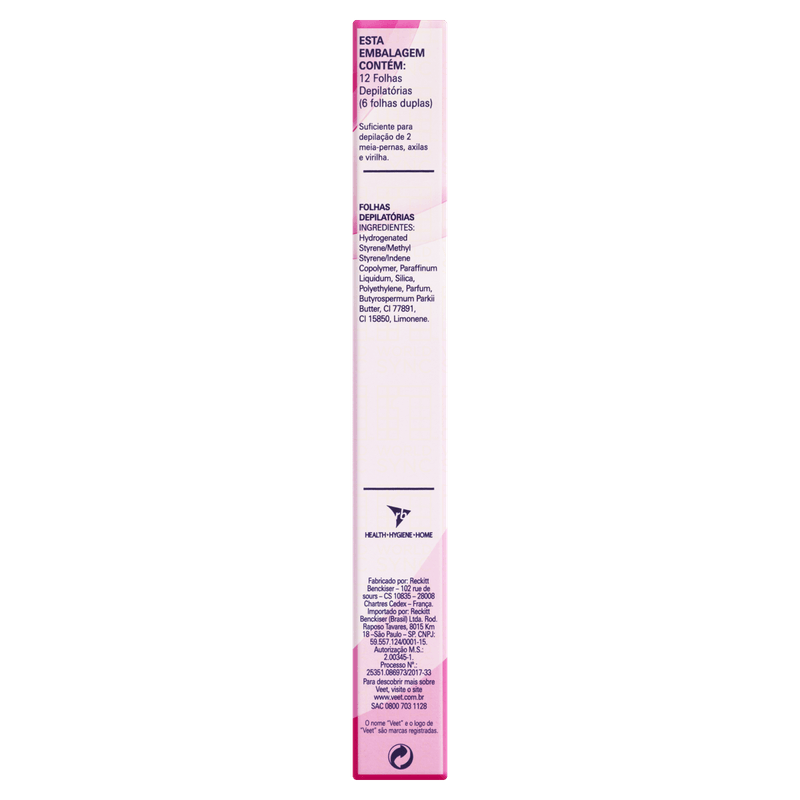 Antes de usar as folhas depilatórias Veet, leia cuidadosamente as precauções e faça o teste de sensibilidade.Composição: Folhas depilatórias: hydrogenated styrene/methyl styrene/indene copolymer, paraffinum liquidum, silica, polyethylene, parfum, butyrospermum parkii butter, Cl 77891, Cl 15850, limonene.