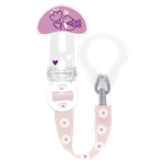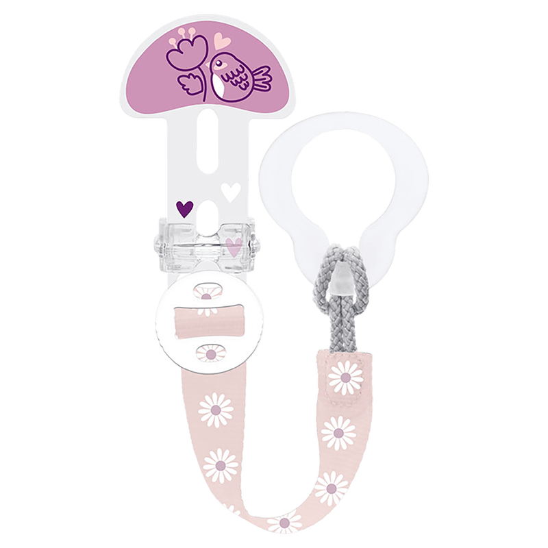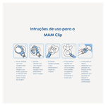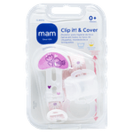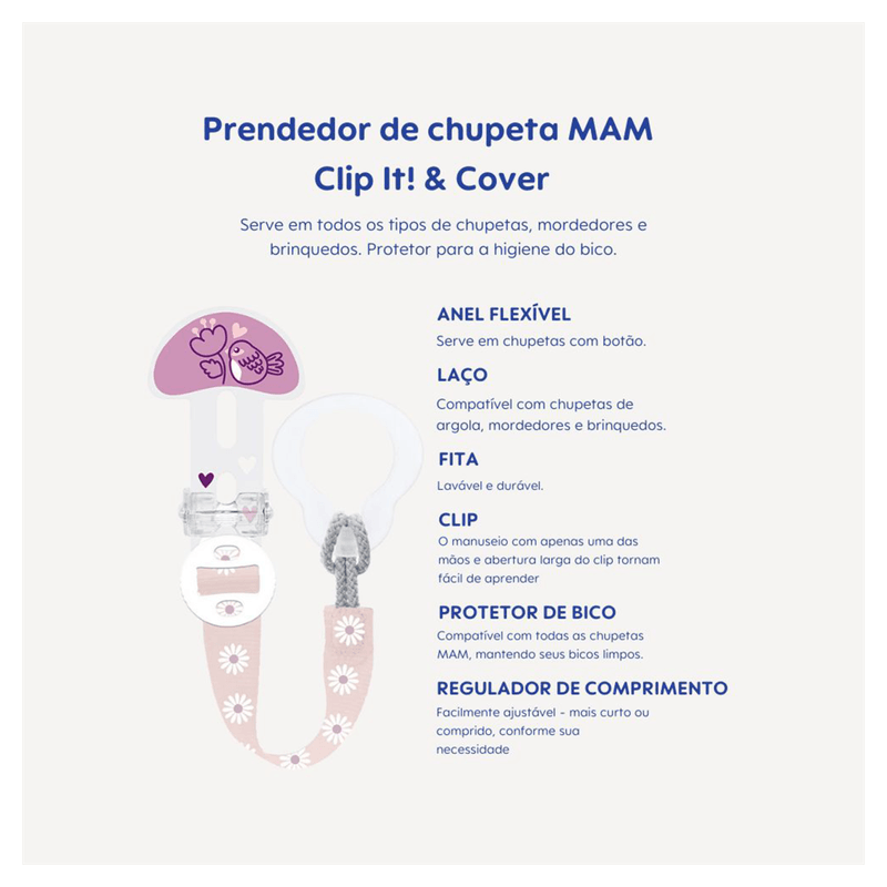 O Prendedor de Chupeta Infantil Clip It & Cover da Mam é um acessório em formato de clipe com fita ajustável e protetor de bico, indicado para bebês e crianças. Apresentado em cores rosa claro, branco e lilás, o produto tem como finalidade principal manter a chupeta sempre segura e limpa, facilitando o manuseio e evitando perdas.