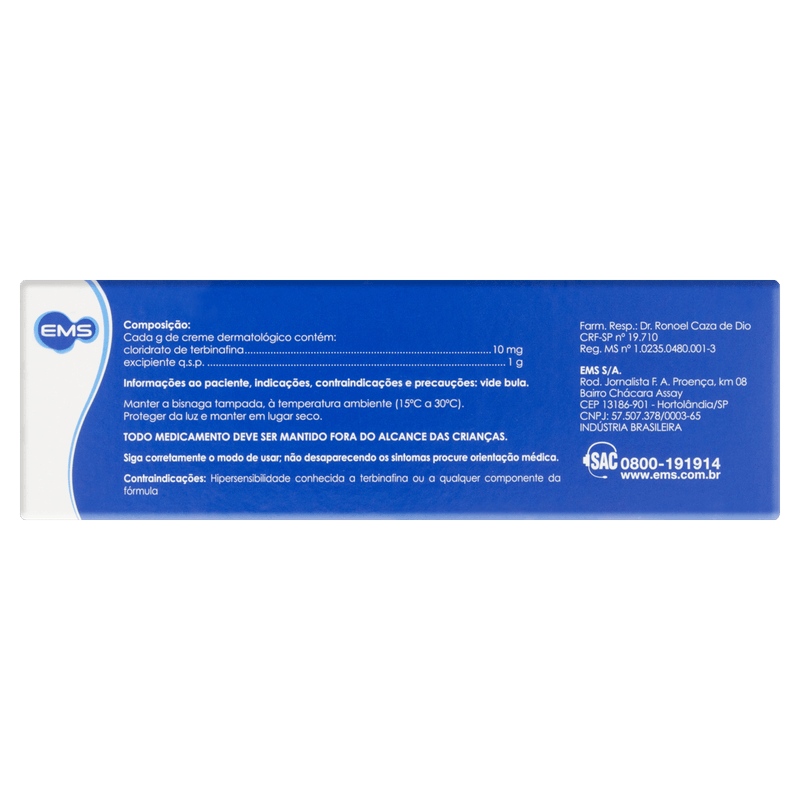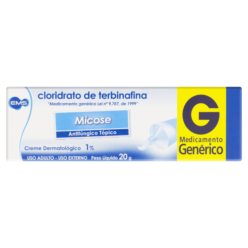 Este creme dermatológico possui textura leve e é indicado para uso externo, com volume de 20 g por embalagem. Sua composição inclui excipientes como simeticona, propilparabeno e metilparabeno, que auxiliam na estabilidade e aplicação do produto. O Cloridrato de Terbinafina EMS é um medicamento genérico, vendido sob prescrição médica, ideal para quem busca um tratamento confiável contra micoses cutâneas.