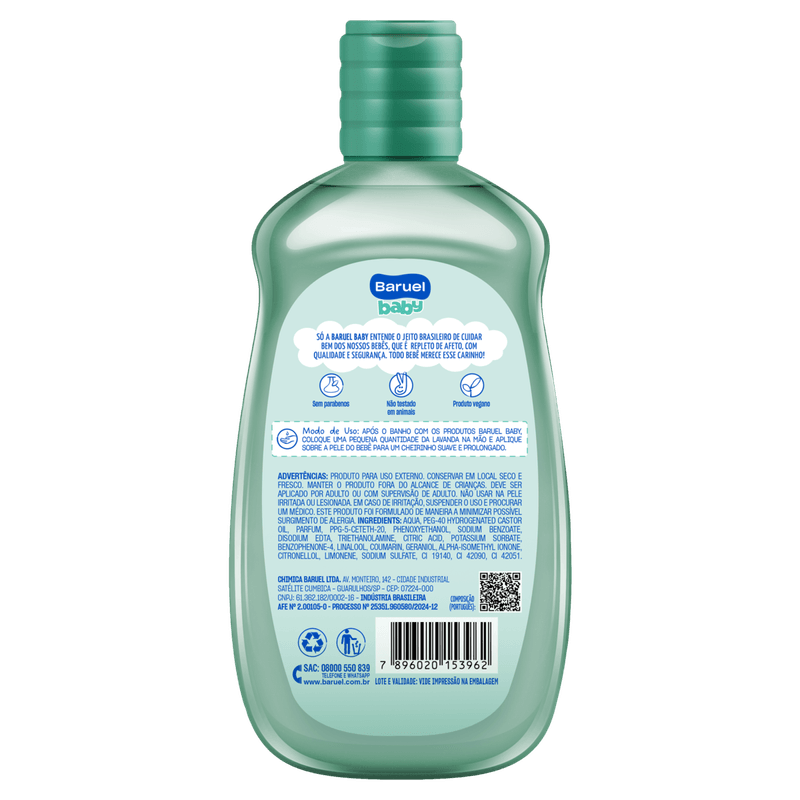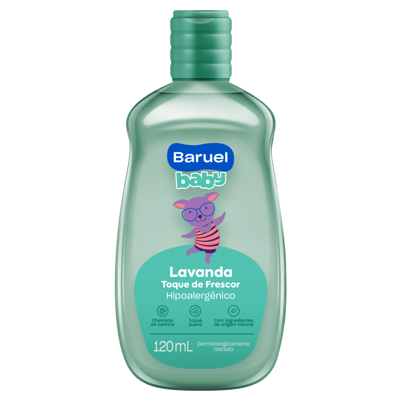 A Colônia Infantil Turma Xuxinha Lavanda da Baruel é apresentada em frasco plástico translúcido de 120 mL, especialmente desenvolvida para bebês e crianças pequenas. Com fragrância suave de lavanda, o produto é indicado para uso diário, proporcionando frescor e cuidado delicado à pele após o banho.