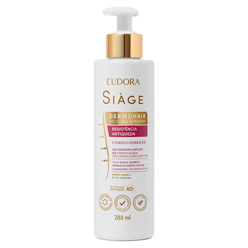 O Condicionador Siàge Dermo Hair Resistência Antiqueda complementa o tratamento contra queda, quebra e enfraquecimento capilar. Sua fórmula com Minoxi-Amenil e Vit-10-Complex, enriquecida com biotina, probióticos e aminoácidos, promove uma ação poderosa que reduz a queda em até 4x e diminui a quebra em 70%. Sua ação desembaraçante sela as cutículas, formando um filme protetor que mantém o tratamento nos fios, garantindo hidratação, maciez e resistência, sem ressecar. Experimente o poder de Siàge Dermo Hair e tenha cabelos mais fortes e saudáveis da raiz às pontas. Ao adquirir esse produto, você está adquirindo um produto oficial de Eudora Siàge, uma marca focada em desenvolver e oferecer tratamentos capilares completos com tecnologia avançada e eficaz para todos os tipos de cabelos. Explorando a marca, você pode construir um cronograma completo de cuidados, para hidratar, recuperar, reconstruir e definir seus fios. Leve para casa linhas completas com shampoo, condicionador, máscara de hidratação e leave-ins. Isso é Siàge: tecnologia que o seu cabelo sente. Nenhum produto Eudora é testado em animais, ou seja, este item possui selo Cruelty Free.