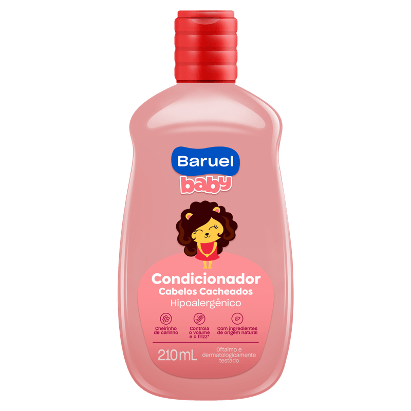 O Condicionador Infantil Baruel Baby Cabelos Cacheados é apresentado em frasco de 210ml, desenvolvido especialmente para bebês e crianças com cabelos cacheados. Sua fórmula suave e hipoalergênica tem como finalidade hidratar, desembaraçar e controlar o volume e o frizz dos cachinhos, promovendo cuidado delicado para os fios e a pele sensível.