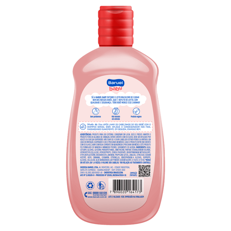 Após lavar os cabelos do bebê com o shampoo Baruel Baby, aplique o condicionador nos fios, massageando suavemente. Enxágue bem em seguida. Utilize sempre que necessário para manter os cachinhos hidratados e fáceis de pentear. Conserve o produto em local fresco e seco, longe da luz direta.