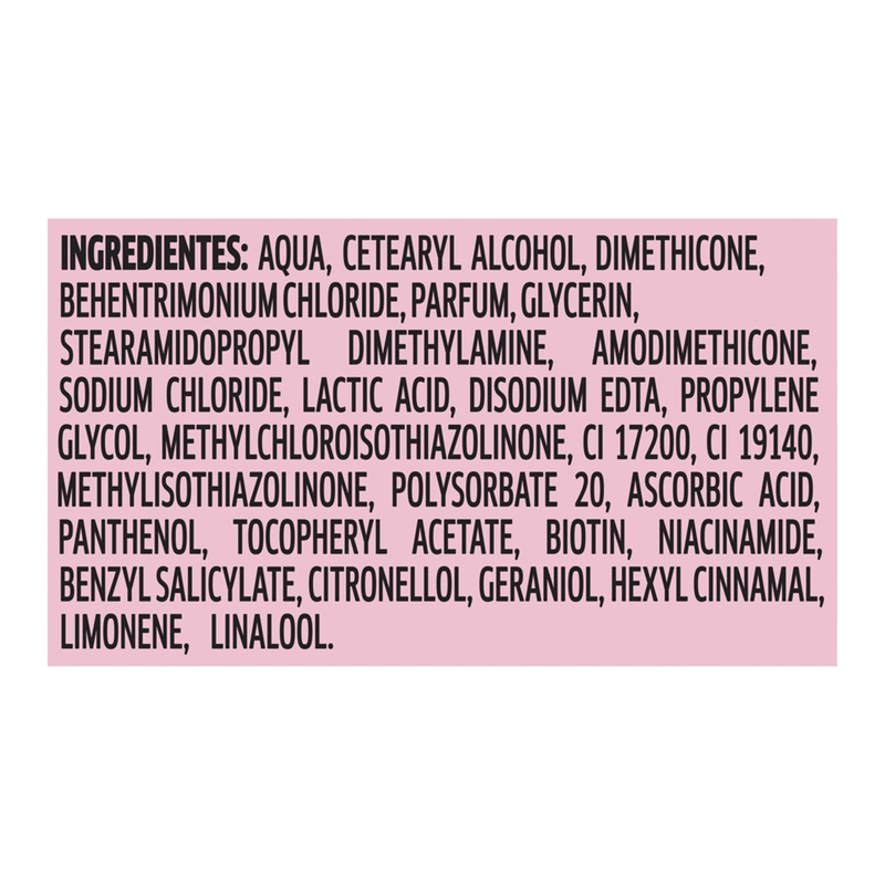Água, álcool cetoestearílico, dimeticona, cloreto de beentrimônio, perfume, glicerol, estearamidopropil dimetilamina, amodimeticona, cloreto de sódio, ácido láctico, edetato dissódico, propilenoglicol, metilcloroisotiazolinona, vermelho 33, amarelo de tartrazina, metilisotiazolinona, polissorbato 20, ácido ascórbico, pantenol, acetato de tocoferila, biotina, nicotinamida, salicilato de benzila, citronelol, geraniol, hexil cinamal, limoneno, linalol.