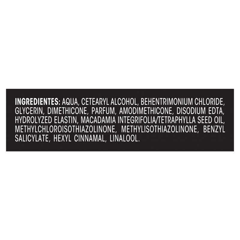 Composição: Aqua, cetearyl alcohol, behentrimonium chloride, glycerin, dimethicone, parfum, amodimethicone, disodium EDTA, hydrolyzed elastin, macadamia integrifolia/tetraphylla seed oil, methylchloroisothiazolinone, methylisothiazolinone, benzyl salicylate, hexyl cinnamal, linalool.