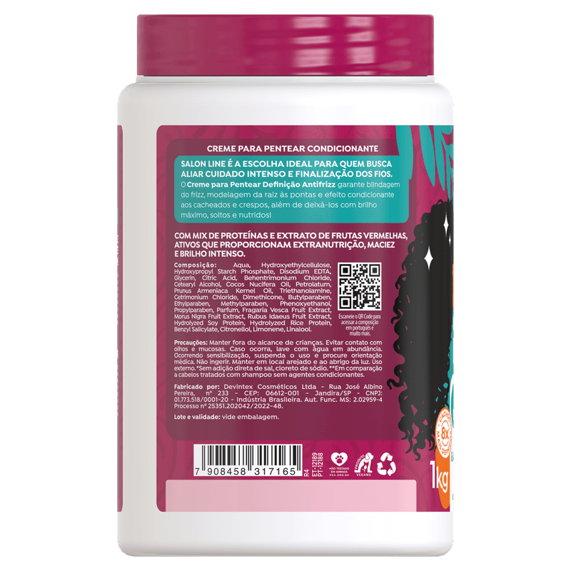 O Creme para pentear Definição Antifrizz Salon Line tem em sua fórmula um mix de proteínas e extrato de frutas vermelhas, ativos que proporcionam nutrição extra, maciez e brilho intenso aos fios, deixando os seus cabelos muito mais soltos e nutridos.