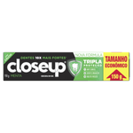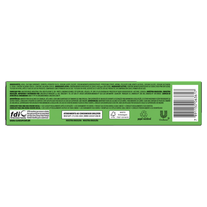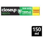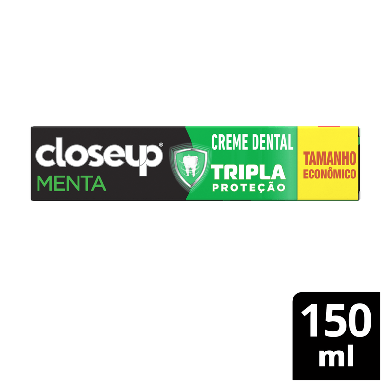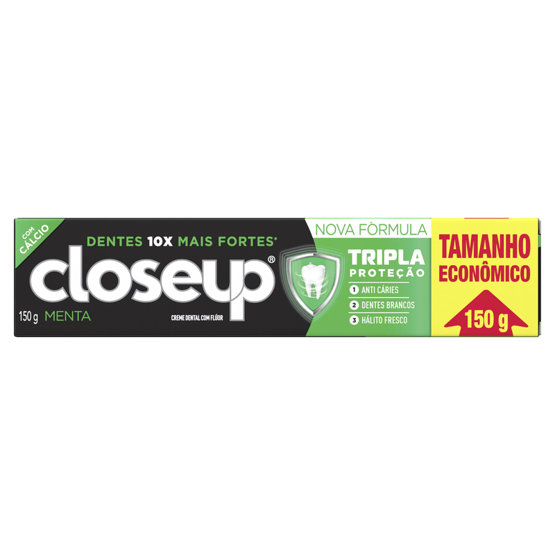 O Creme Dental Closeup Tripla Proteção Menta possui uma fórmula com cálcio e flúor bioativo que proporciona dentes 10x mais fortes*. Além de tripla proteção que garante dentes brancos, proteção anticáries e hálito fresco. Sua fórmula promove uma limpeza eficaz, oferecendo um hálito fresco e duradouro. O flúor bioativo previne às cáries, enquanto o cálcio auxilia no fortalecimento dos dentes. Além disso, a pasta de dente Closeup Tripla Proteção Menta ajuda na remoção de manchas da superfície dos dentes, deixando-os mais brancos a cada escovação. O sabor do Tripla Proteção Menta apresenta notas de menta (peppermint menthol), acrescentadas de uma combinação única de notas de anis e eucalipto, com um toque sutil de sálvia. Aprecie o frescor do sabor de menta. Hálito fresco, dentes brancos, proteção anticáries e dentes 10x mais fortes* para você ter confiança de chegar mais perto. O Creme Dental Closeup Tripla Proteção Menta está disponível nos tamanhos de 70 g e 150 g. Experimente também as outras variedades de Closeup Tripla Proteção: Hortelã e Menta Americana. Ao escovar seus dentes todos os dias após as refeições com creme dental, escova de dentes e enxaguante bucal Closeup, você os protege contra as bactérias e o mau hálito. A Federação Dental Internacional reconhece que escovar os dentes duas vezes por dia com um creme dental com flúor como “Closeup Tripla Proteção Menta” é benéfico para a saúde bucal.