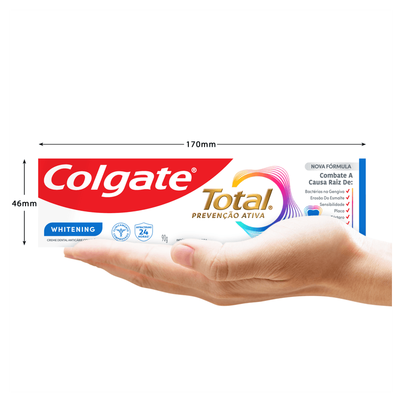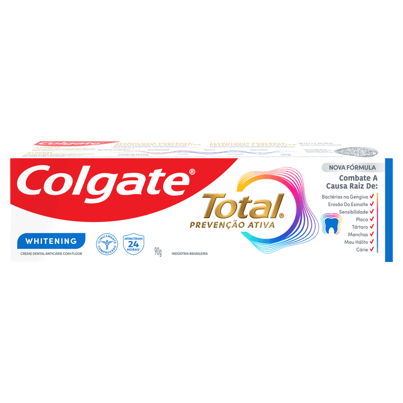 A pasta de dentes com Zinco Colgate Total 12 Whitening é ideal para uma saúde bucal completa, fornecendo até 12 horas de defesa ativa contra bactérias*, enquanto ajuda a remover manchas dos dentes.