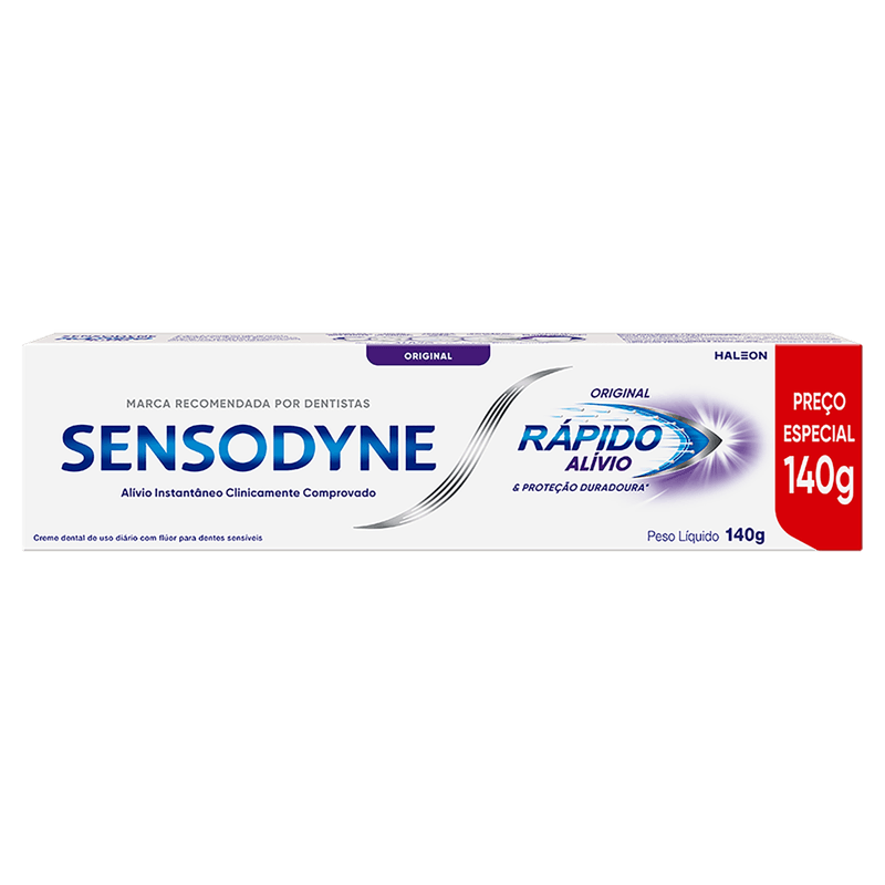 A Pasta de dentes Sensodyne Rápido Alívio, com flúor, oferece um alívio imediato e prolongado da sensibilidade dentária. A sensibilidade dentária é uma sensação dolorosa e aguda causada pela exposição da dentina a determinadas bebidas e alimentos frios, quentes, cítricos e doces, como café, sopas, sorvetes, frutas e sobremesas. Essa sensação provoca desconforto imediato, muitas vezes interrompendo a pessoa durante sua refeição.