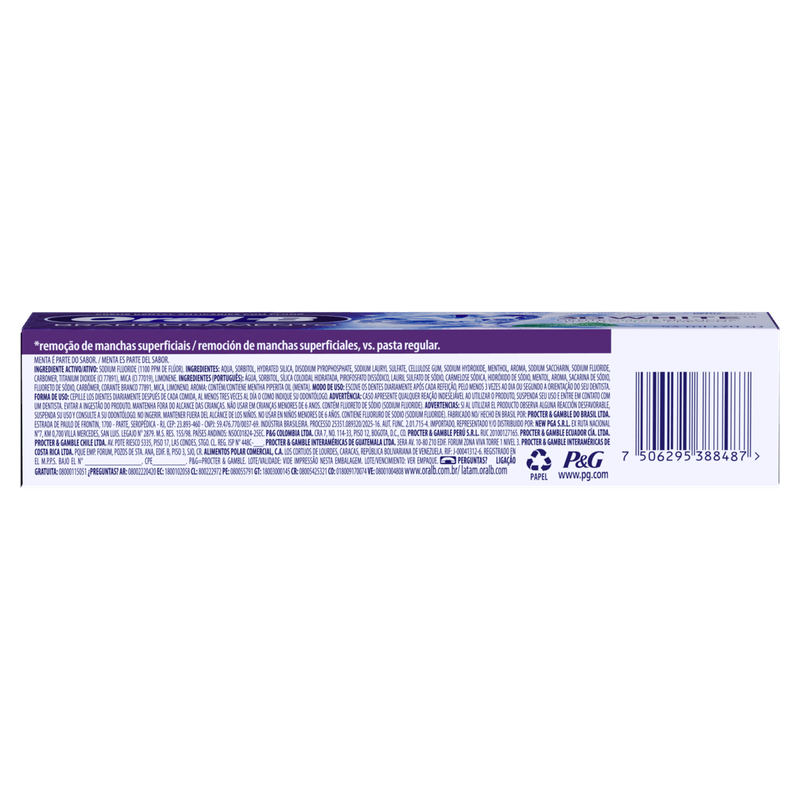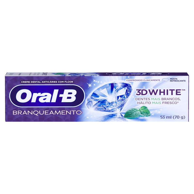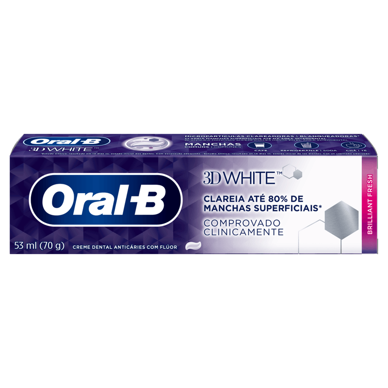 Oral-B 3D White branqueia os dentes: remove até 80% das manchas superficiais em apenas 2 semanas. Seus dentes mais brancos* e protegidos.