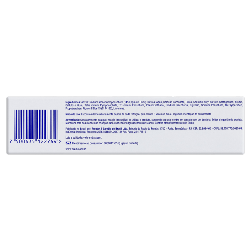 Outros: aqua, calcium carbonate, silica, sodium lauryl sulfate, carrageenan, aroma, cellulose gum, tetrasodium pyrophosphate, trisodium phosphate, phenoxyethanol, sodium saccharin, glycerin, sodium phosphate, methylparaben, propylparaben, pigment blue 15 (CI 74160), limonene.