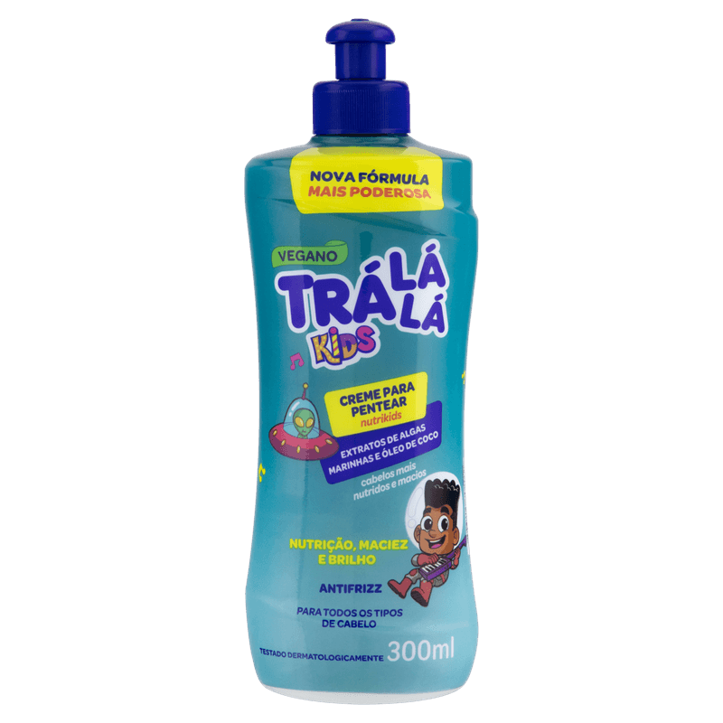 O Creme para Pentear Infantil Nutrikids Tra La La Óleo de Coco Brilho e Proteção é apresentado em frasco de 300 ml, indicado para o cuidado dos cabelos delicados de crianças a partir de 3 anos. Formulado para facilitar o desembaraço, hidratar e proteger os fios, é ideal para o público infantil, promovendo brilho e maciez.