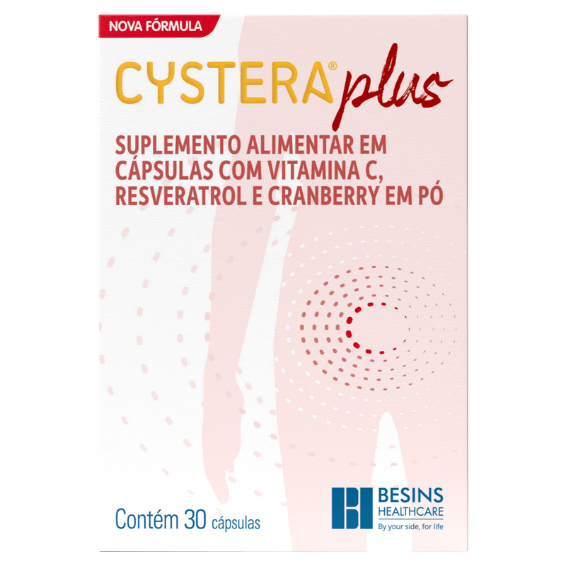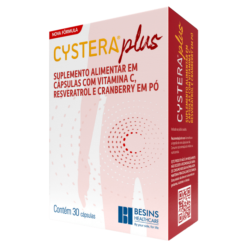 Cystera Plus atua dificultando a adesão de bactérias ao trato urinário, prevenindo infecções e promovendo o equilíbrio da microbiota local. Sua composição inclui triglicerídeos de cadeia média, cranberry em pó (Vaccinium macrocarpon), trans-resveratrol sintético, ascorbato de sódio, colecalciferol, gelatina, sorbitol, glicerol, lecitina de soja, dióxido de silício e corantes naturais. O produto é apresentado em cápsulas orais, sem sabor especificado, com embalagem contendo 30 unidades. Indicado para adultos, não requer prescrição médica e não possui tarja.