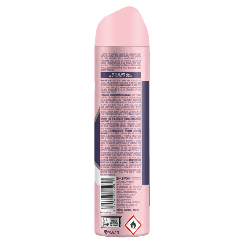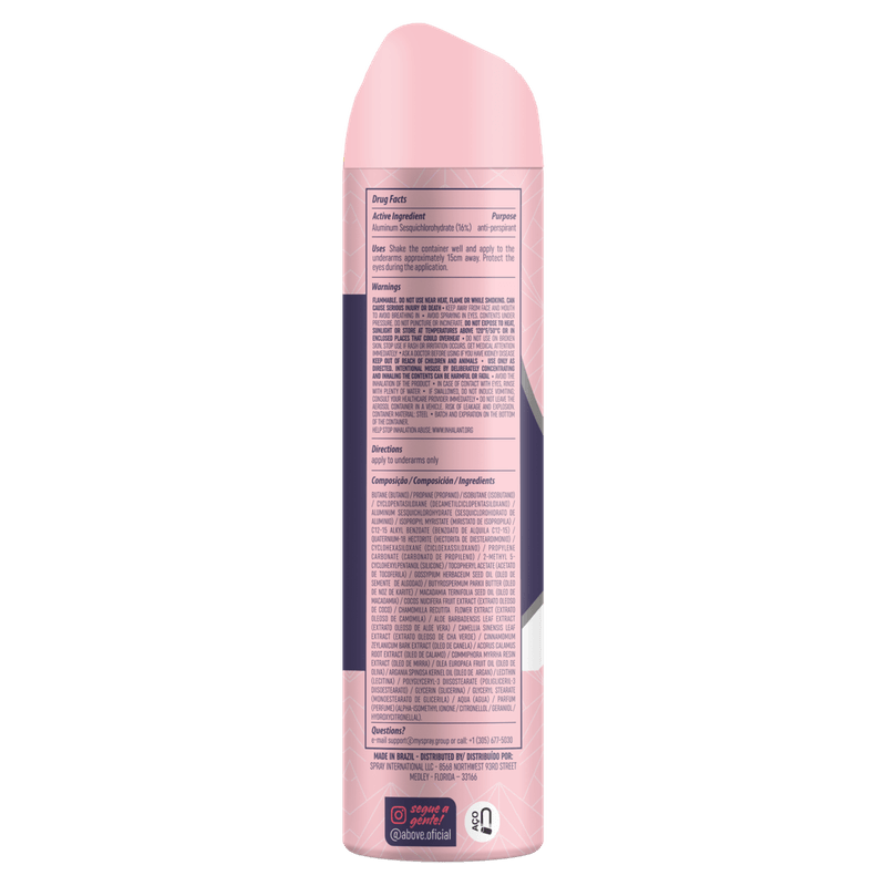 Antes de usar leia as instruções do rótulo.Composição: Butano, propano, isobutano, decametilciclopentasiloxano, sesquiclorohidrato de aluminio, miristato de isopropila, benzoato de alquila C12-15, hectorita de diesteardimonio, cicloexassiloxano, carbonato de propileno, silicone, acetato de tocoferila, óleo de semente de algodão, óleo de noz de karité, óleo de macadâmia, extrato oleoso de coco, extrato oleoso de camomila, extrato oleoso de aloe vera, extrato oleoso de chá verde, óleo de calena, óleo de calamo, óleo de mirra, óleo de oliva, óleo de argan, lecitina, poligliceril-3 diisoestearato, glicerina, monoestearato de glicerila, água, perfume, alpha-isomethyl ionone, citronellol, geraniol, hydroxycitronellal.