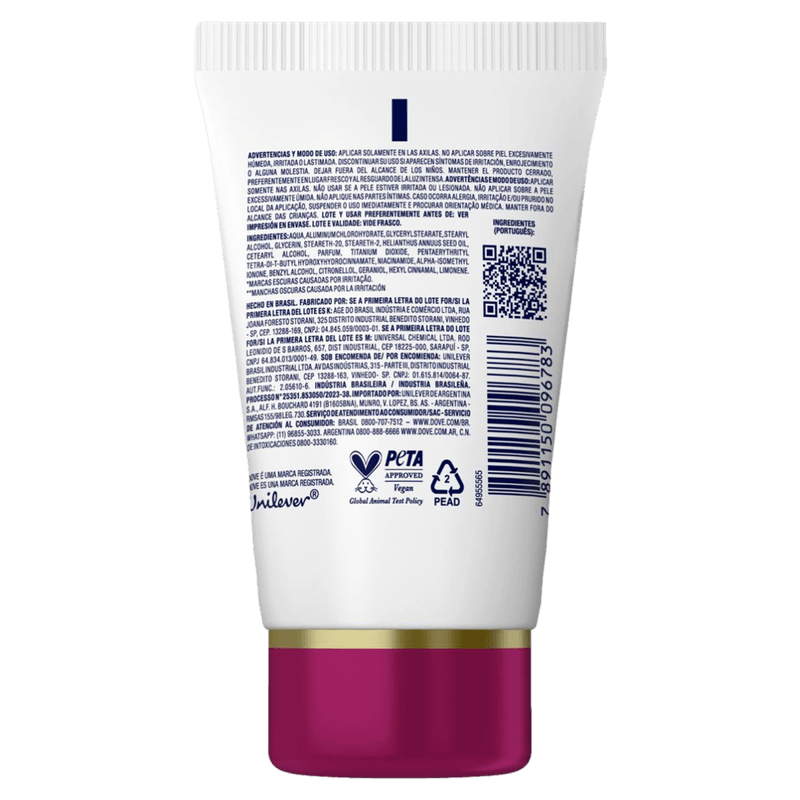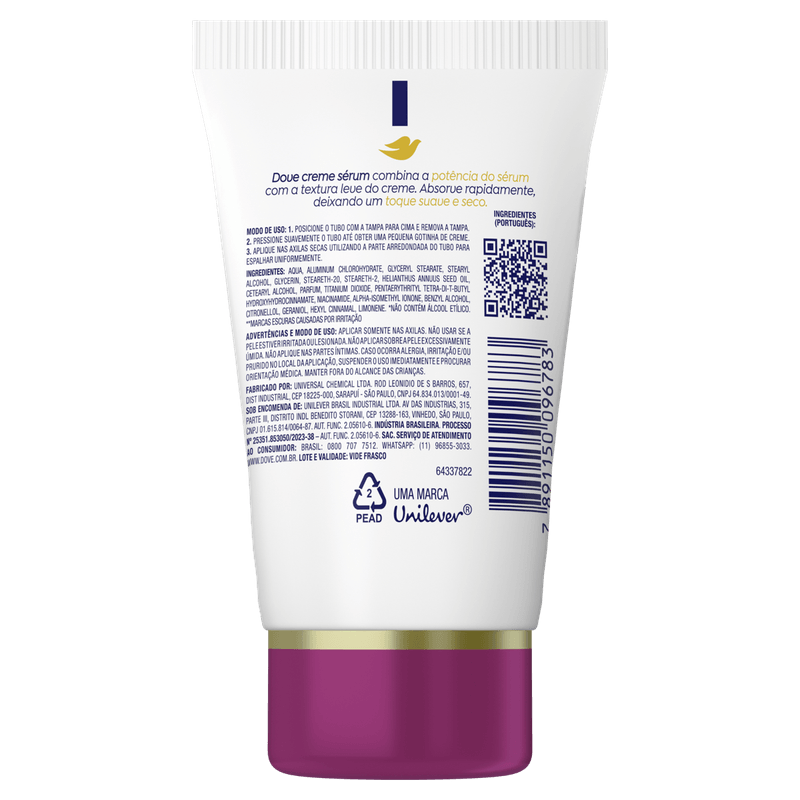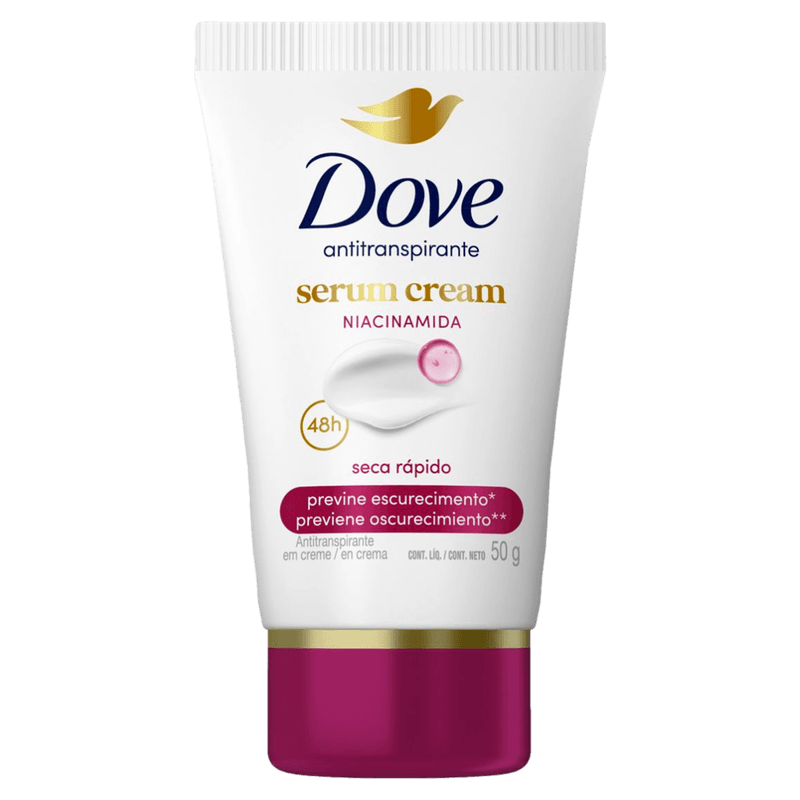 Dove Previne Escurecimento 48h é um desodorante antitranspirante sérum creme com aplicador anatômico e desenvolvido com ¼ de creme hidratante + vitamina B3 e Niacinamida.