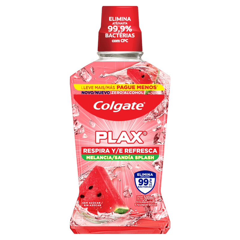 O Colgate Plax Enxaguante Bucal Melancia Sem Álcool Zero Açúcar 500ml é um antisséptico bucal eficaz que elimina até 99,9% das bactérias, promovendo um hálito fresco e duradouro. Com sabor suave e refrescante de melancia, é ideal para quem busca uma higienização completa sem o desconforto do álcool e sem adição de açúcar. Sua fórmula sem álcool é indicada para uso diário, garantindo proteção e cuidado para toda a família, especialmente para quem tem sensibilidade bucal.