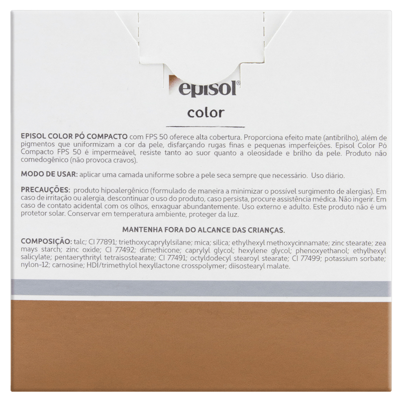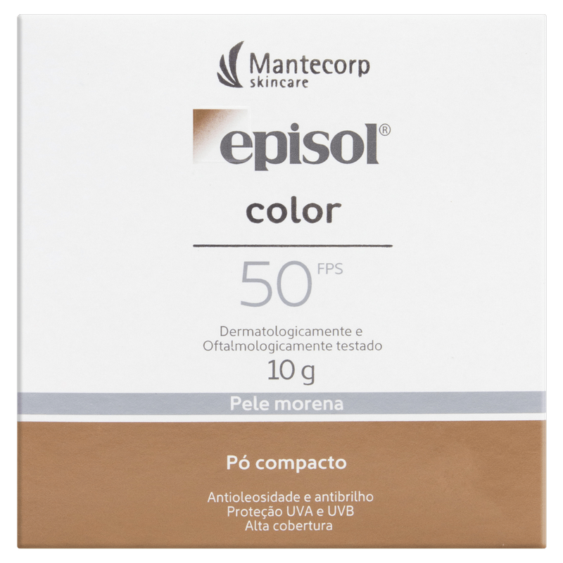 O Pó Compacto Episol Color FPS 50 na tonalidade Pele Morena é um protetor solar facial com cor em formato de pó compacto, que oferece alta proteção contra os raios UVA, UVB, infravermelho A e luz visível, além de uniformizar o tom da pele com efeito matte e toque seco.