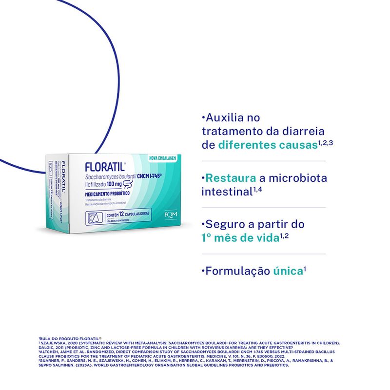 Floratil 100mg é um probiótico em cápsulas gelatinosas duras, indicado para auxiliar no tratamento de diarreias de diversas causas e na restauração da flora intestinal, incluindo casos causados por Clostridium difficile. Cada cápsula contém 100 mg de Saccharomyces boulardii CNCM I-745 liofilizado, com no mínimo 0,5 x 109 células viáveis, garantindo eficácia mesmo durante o uso de antibióticos e quimioterápicos. Ideal para adultos e crianças, Floratil promove o equilíbrio da microbiota intestinal, contribuindo para a melhora rápida dos sintomas e recuperação do bem-estar digestivo.