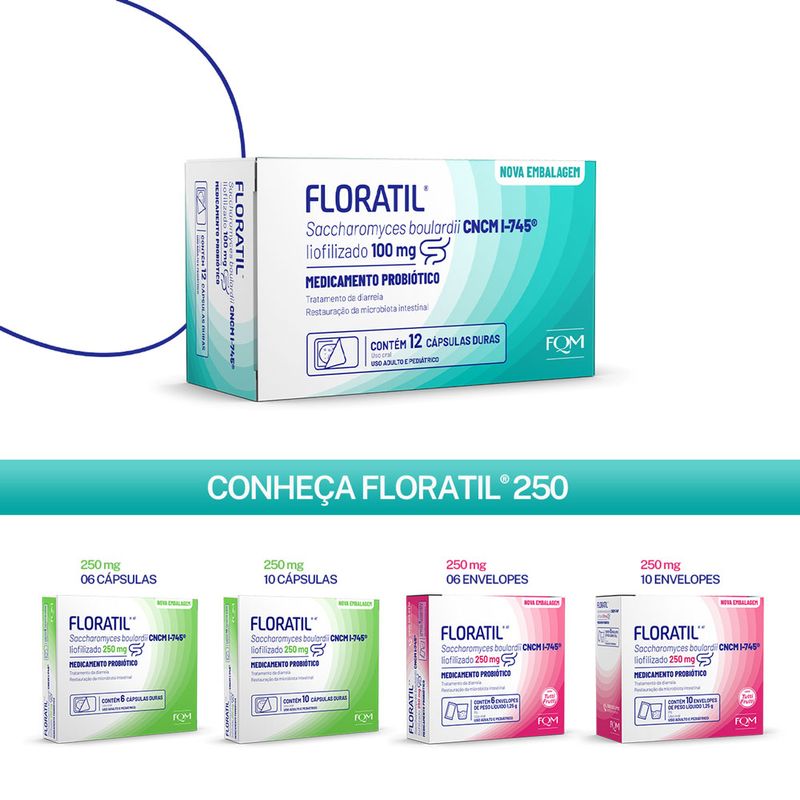 Floratil 100mg atua diretamente na restauração da flora intestinal, sendo resistente à ação dos sucos gástricos, bile, antibióticos e quimioterápicos, o que assegura sua ação durante o tratamento. Apresenta-se em embalagem com 12 cápsulas gelatinosas duras, sem sabor especificado, e é destinado ao público adulto e pediátrico. A venda é sob prescrição médica, com tarja vermelha, reforçando a importância do acompanhamento profissional durante o uso.