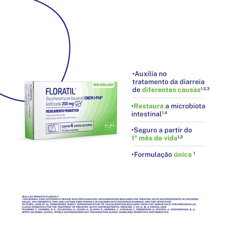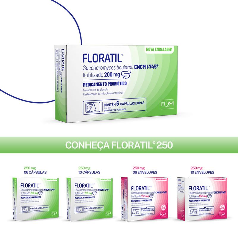 Cada cápsula contém 200mg de Saccharomyces boulardii CNCM I-745, com no mínimo 1 x 109 células, além de excipientes como estearato de magnésio e lactose. O produto é indicado para uso oral, sem sabor, e não possui tarja. É contraindicado para pessoas com alergia à substância ativa ou a qualquer componente da fórmula, e deve ser usado com cautela por diabéticos devido à presença de açúcar e lactose. Floratil é um probiótico confiável, com ação específica na saúde gastrointestinal, indicado para adultos e crianças, disponível em embalagem com 6 cápsulas.