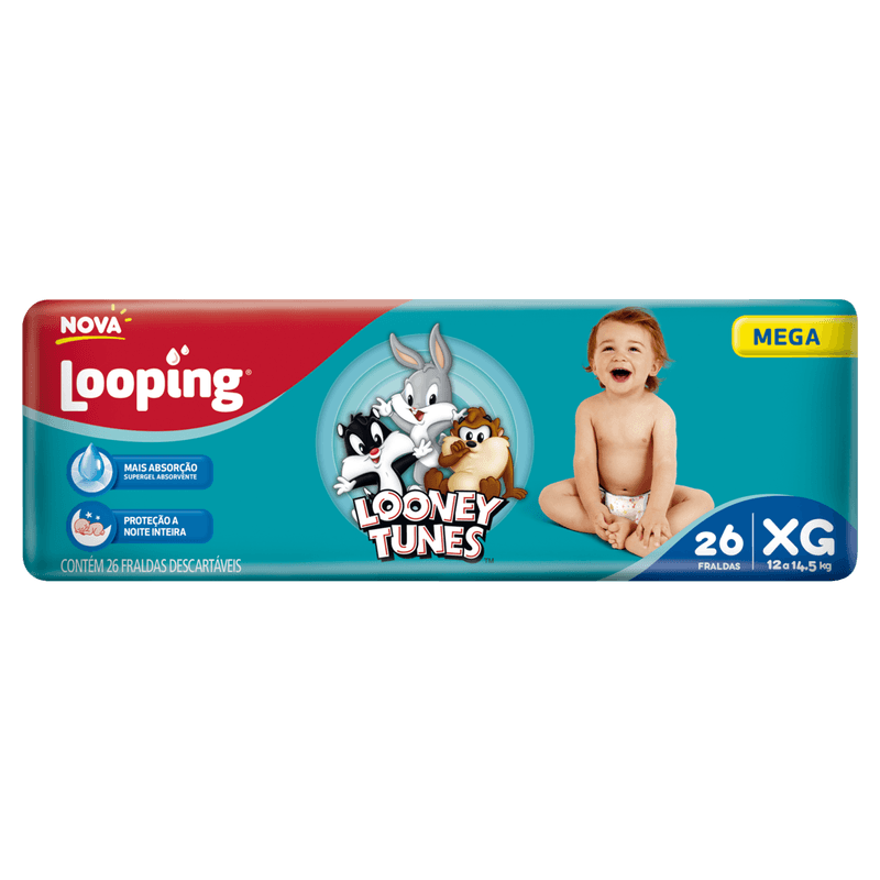 A Fralda Descartável Looney Tunes Super Gel Absorvente 10h Cintura Elástica Looping Mega XG é ideal para bebês de 12 a 15 kg, oferecendo até 10 horas de proteção contínua. Com tecnologia de super gel absorvente e multicamadas, garante alta retenção de líquidos, mantendo a pele do bebê seca e saudável. A cintura elástica proporciona ajuste confortável, enquanto o fecho adesivo gruda e desgruda permite ajustes fáceis e seguros. Seu toque macio e cobertura externa suave asseguram conforto durante o uso, além das divertidas estampas dos personagens Looney Tunes que tornam o momento do bebê mais alegre.