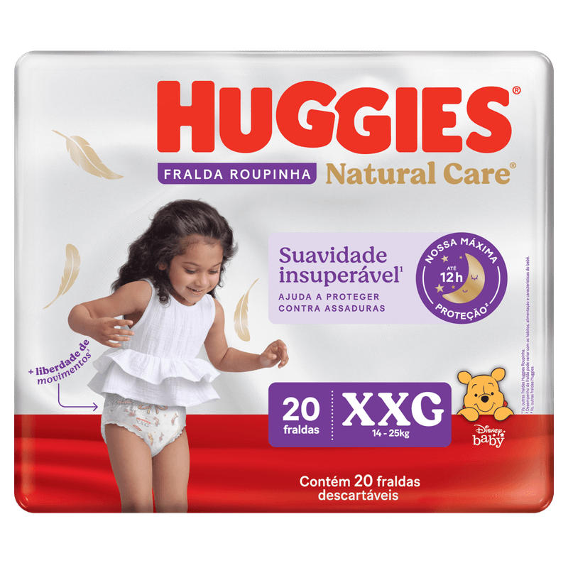 A Fralda Descartável Infantil Natural Care Roupinha Huggies tamanho XXG é indicada para bebês que necessitam de alta absorção, oferecendo proteção e conforto tanto para uso diurno quanto noturno. Desenvolvida no formato roupinha, facilita o vestir e proporciona ajuste confortável ao corpo da criança.