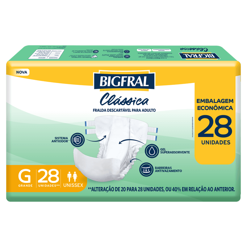 A Fralda Geriátrica Bigfral Clássica garante proteção eficaz para trocas frequentes, oferecendo rápida absorção e barreiras que evitam vazamentos. Sua estrutura com canais de distribuição ajuda a manter a pele seca e protegida, além de contar com indicador de umidade para facilitar o momento da troca. Enriquecida com Aloe Vera e dermatologicamente testada, proporciona mais segurança, conforto e cuidado à pele.