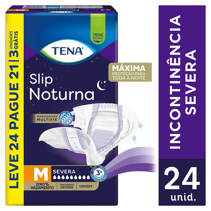 A Fralda Adulto descartável Tena Slip Noturna tamanho M é indicada para incontinência urinária moderada a intensa, com alta absorção e uso recomendado principalmente durante o período noturno.