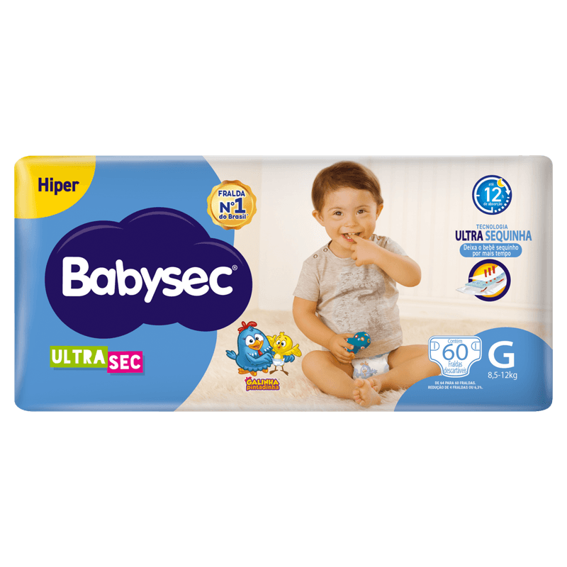 Com camada extra de proteção, sistema anti-vazamento e respirabilidade, a fralda Babysec Ultra Sec atua diretamente na prevenção de assaduras e desconfortos. Sua composição inclui gel ultra absorvente e tecido macio, com fechamento adesivo em velcro para fácil ajuste. A embalagem contém 60 unidades, ideal para uso infantil, especialmente para bebês que necessitam de fraldas tamanho G. A textura suave e o formato ajustável garantem conforto prolongado, tornando essa fralda uma escolha confiável para o cuidado diário do seu pequeno.