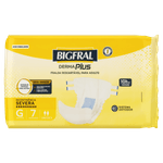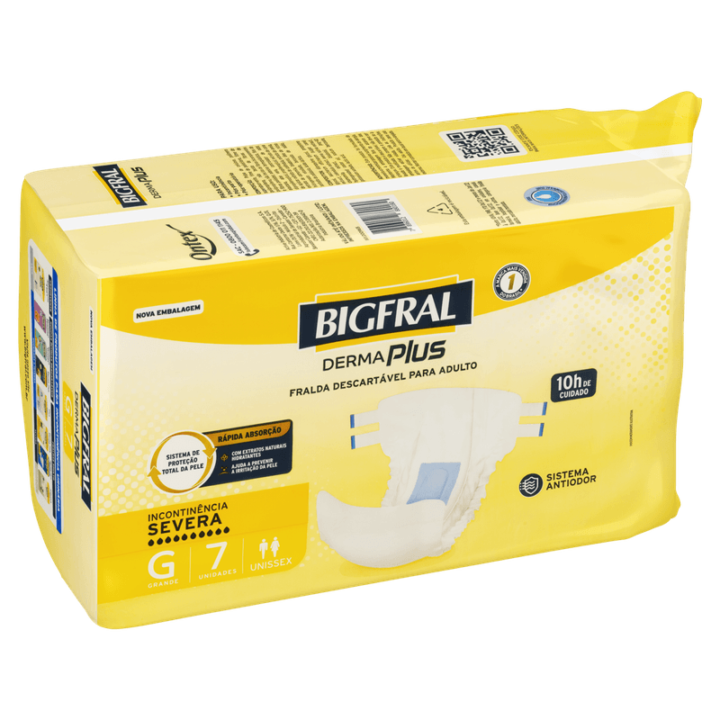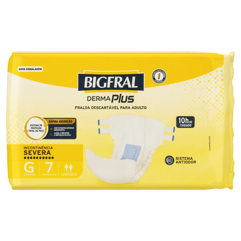 A fralda atua diretamente na absorção rápida da urina, distribuindo o líquido para manter a pele seca e reduzir o retorno, o que ajuda a prevenir assaduras. Indicada para adultos de ambos os sexos, possui tamanho G (grande) e vem em embalagem com 7 unidades. Sua textura é macia e confortável, com formato tradicional que se adapta bem ao corpo, ideal para uso prolongado. A Bigfral Derma Plus é uma solução prática e confiável para quem busca proteção, cuidado e conforto em situações de incontinência severa.
