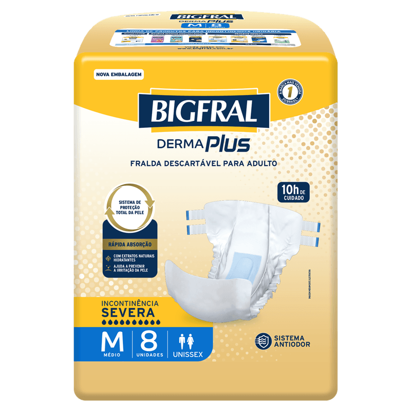 Este produto atua diretamente na proteção da pele contra umidade e odores, sendo indicado para adultos com pele sensível e necessidade de alta absorção. A fralda é do tipo tradicional, tamanho M, unissex, com capacidade para uso severo. Apresenta textura macia e acolchoada, facilitando o conforto durante o uso. A embalagem contém 8 unidades, ideal para uso prático e contínuo. A Fralda Bigfral Derma Plus M é a escolha certa para quem busca segurança, cuidado e conforto em situações de incontinência severa.