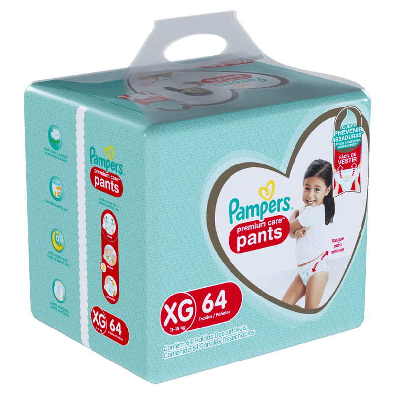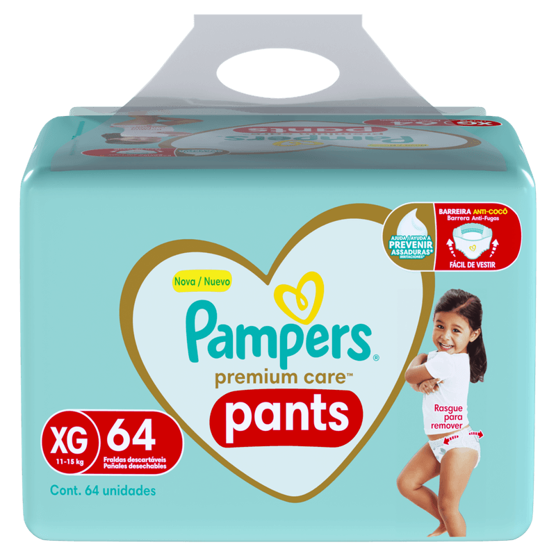A Fralda Pampers Pants Premium Care XG é ideal para bebês que precisam de conforto e proteção durante o dia e a noite. Com cintura elástica 360°, adapta-se perfeitamente ao corpo, garantindo ajuste seguro e liberdade de movimento. Sua tecnologia com gel superabsorvente mantém a pele seca por até 12 horas, prevenindo assaduras com loção hipoalergênica e barreiras duplas anti-vazamento, incluindo proteção extra nas costas contra vazamentos e cocô. Fácil de vestir como um shortinho e simples de remover, é perfeita para bebês ativos e para pais que buscam praticidade.