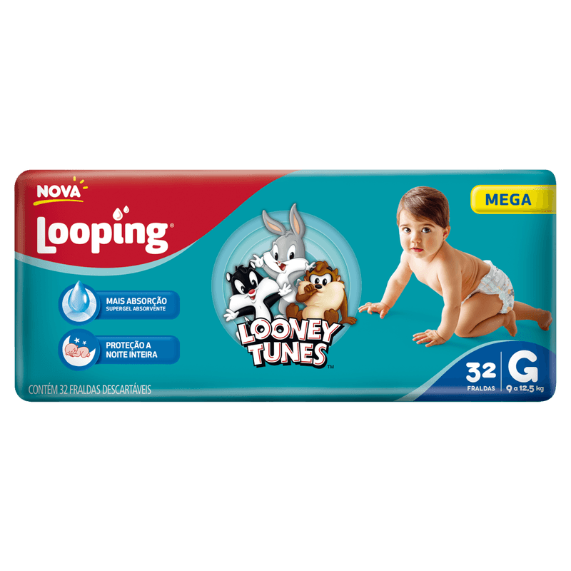 As Fraldas Descartáveis Looney Tunes Mega G com 32 unidades são ideais para pais que buscam conforto e proteção para seus bebês. Com cintura elástica, garantem ajuste perfeito e liberdade de movimento, enquanto o fecho adesivo gruda e desgruda permite ajustes rápidos e seguros. A tecnologia de super gel absorvente e multicamadas proporciona alta capacidade de retenção de líquidos, mantendo a pele do bebê seca por até 10 horas, reduzindo trocas e prevenindo irritações.