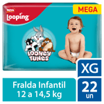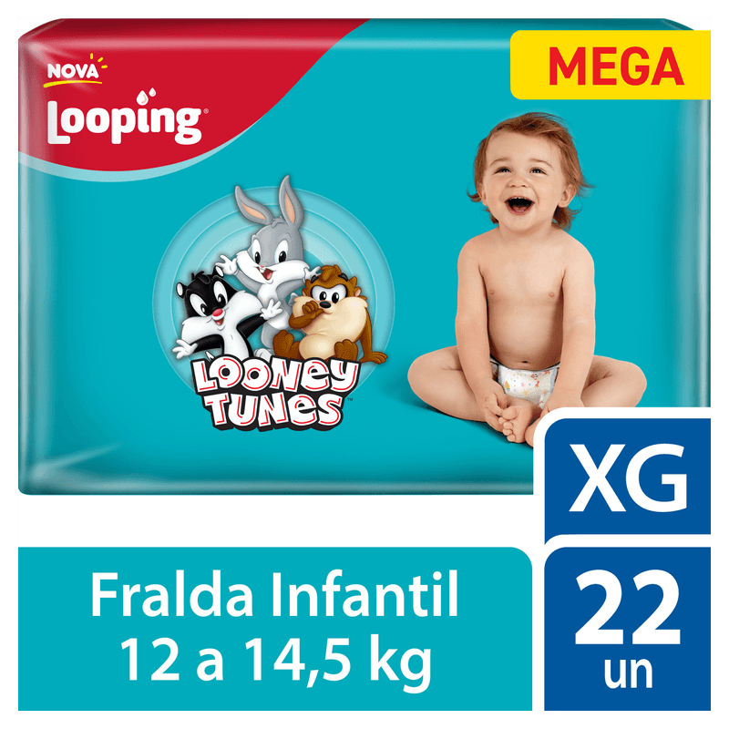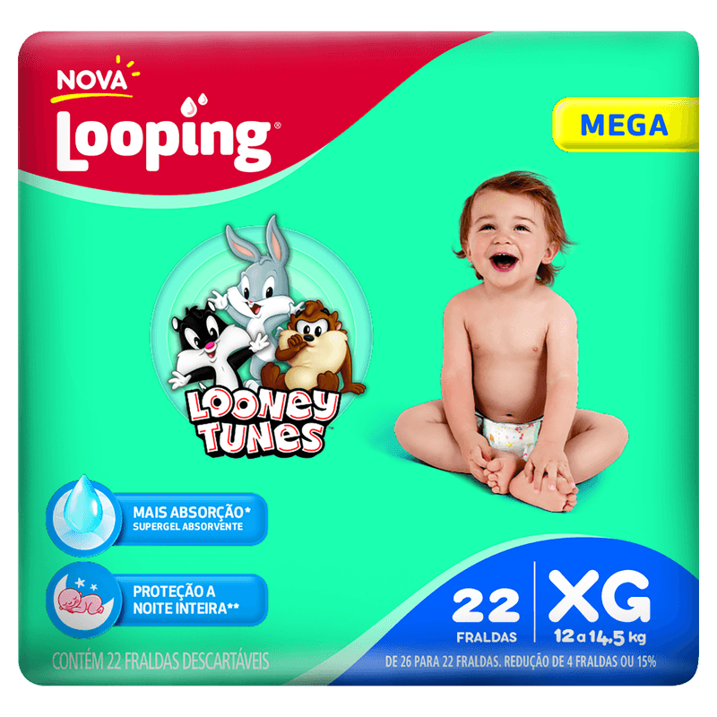 A Fralda Descartável Looping XG com 22 unidades oferece alta absorção e proteção antivazamento, ideal para bebês de 12 a 14,5 kg. Seu design com personagens da Looney Tunes torna o momento do uso mais divertido, enquanto a tecnologia hipoalergênica garante conforto e segurança para peles sensíveis. A camada extra proporciona maior proteção, ajustando-se perfeitamente ao corpo do bebê para evitar vazamentos e manter a pele seca por mais tempo.