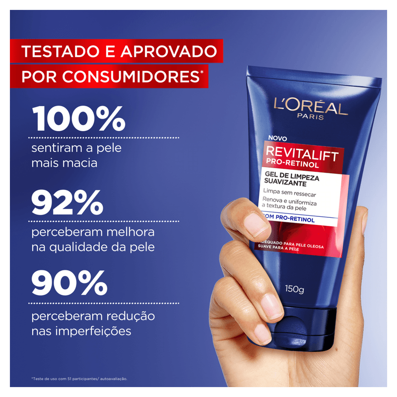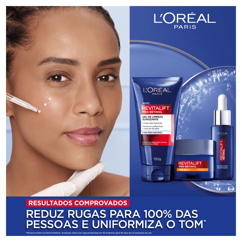 Desenvolvido pelos laboratórios de L'Oréal Paris para renovar a textura da pele, o Gel de Limpeza Suavizante Revitalift Pro-Retinol possui um alto poder de limpeza da pele, uniformizando a textura e eliminando impurezas, sem ressecar. Adaptado para pele mista a oleosa.