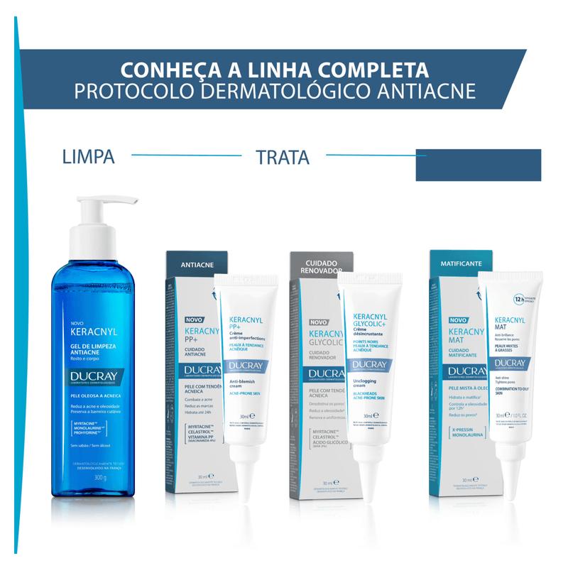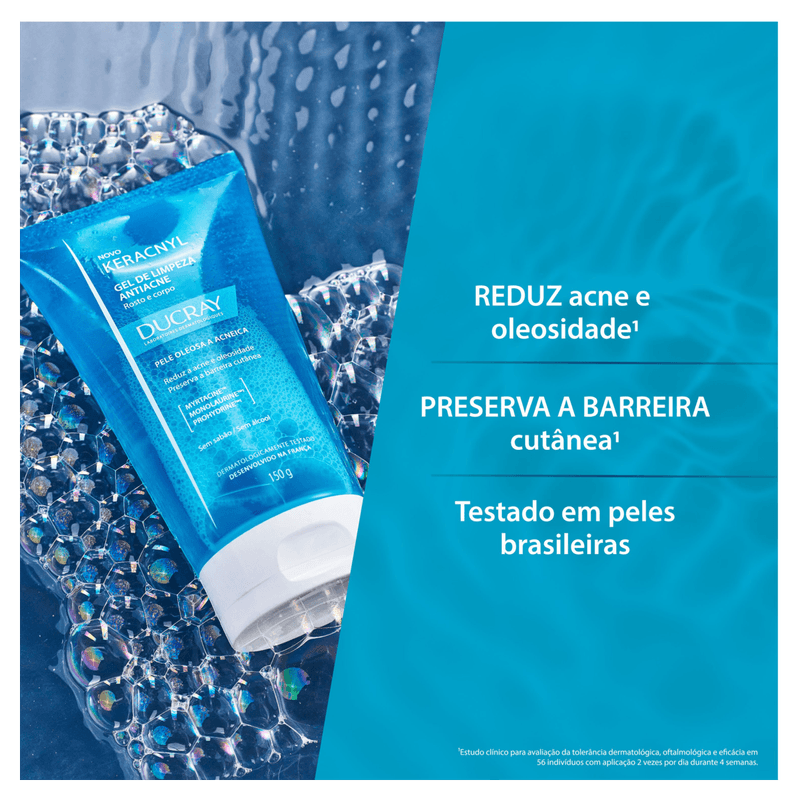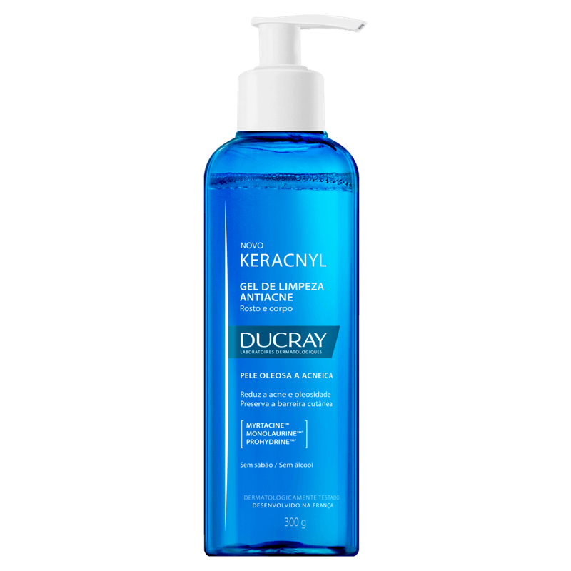 O Gel de Limpeza Antiacne Keracnyl da Ducray é ideal para peles oleosas e acneicas, promovendo limpeza profunda e redução de imperfeições. Com fórmula biodegradável, cruelty free e vegana, atua no combate à acne, reduzindo 98% das lesões no primeiro mês e 89% da oleosidade. Contém Mirtacina®, que combate a bactéria C. acnes e ajuda a eliminar espinhas. Recomendado para adolescentes e adultos a partir de 9 anos, pode ser utilizado no rosto e corpo. Para melhores resultados, aplique duas vezes ao dia na pele úmida. O produto é feito no Brasil e é adequado para quem busca uma solução eficaz contra a acne, mantendo a barreira cutânea saudável. Dermatologicamente testado, contém ingredientes que acalmam e corrigem imperfeições, controlam a oleosidade e reforçam a barreira hidrolipídica da pele. Advertências: manter fora do alcance de crianças, não aplicar nas pálpebras e ao redor dos olhos, e enxaguar imediatamente em caso de contato com os olhos.