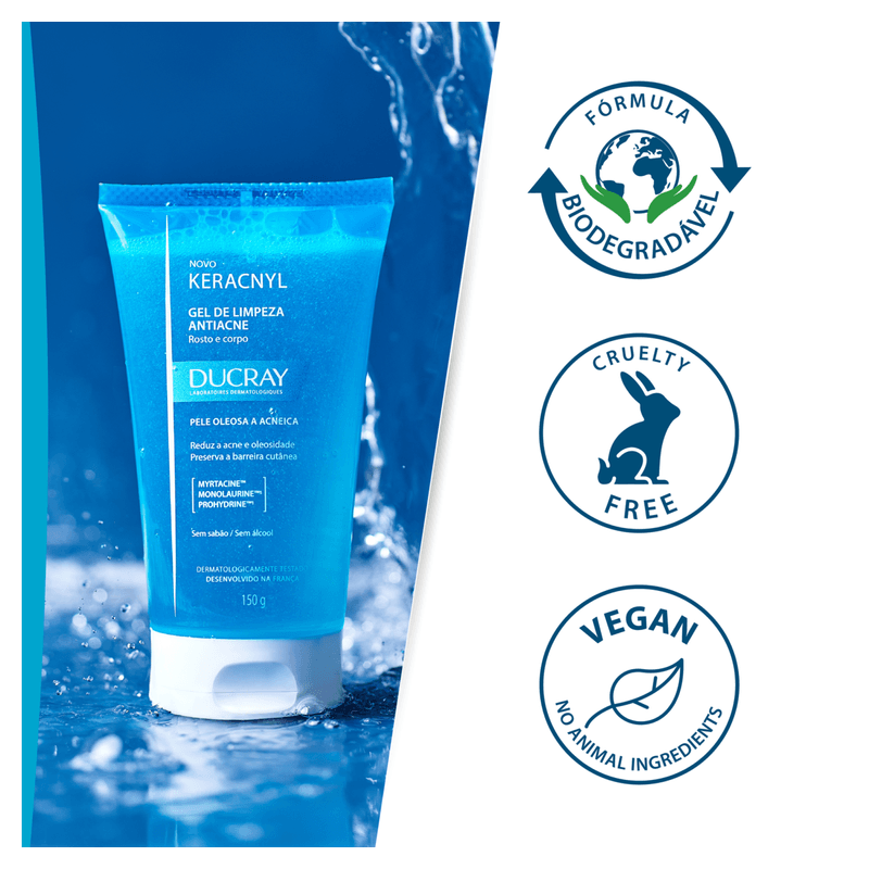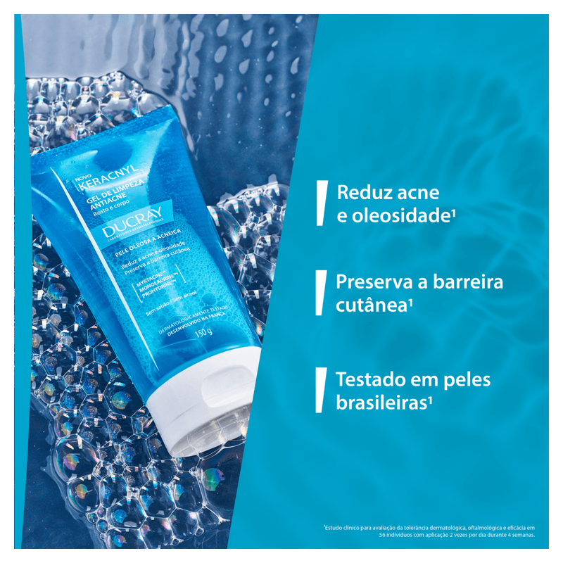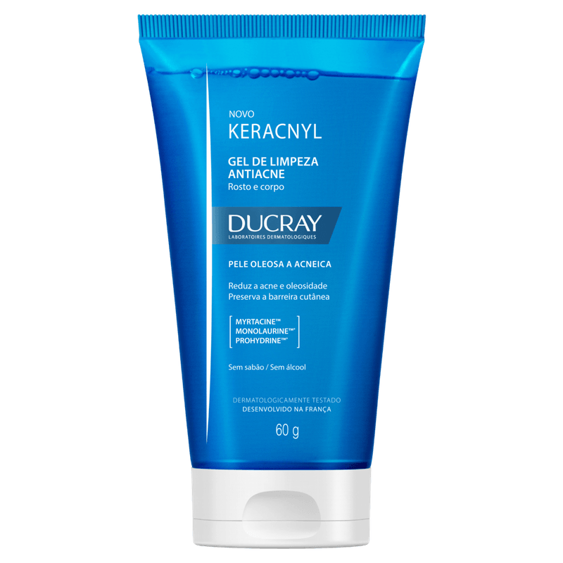 O Gel de Limpeza Antiacne Keracnyl da Ducray é ideal para peles oleosas e acneicas, promovendo limpeza profunda e redução de imperfeições. Com fórmula biodegradável, cruelty free e vegana, atua no combate à acne, reduzindo 98% das lesões em um mês e 89% da oleosidade. Contém Mirtacina®, que combate a bactéria C. acnes e ajuda a eliminar espinhas. Recomendado para adolescentes e adultos a partir de 9 anos, pode ser usado no rosto e corpo. Para melhores resultados, aplique duas vezes ao dia sobre a pele úmida. O produto é feito no Brasil e possui textura leve, ideal para uso diário. Dermatologicamente testado, contém ingredientes que preservam a barreira cutânea e controlam a oleosidade. Advertências: manter fora do alcance de crianças, não aplicar nas pálpebras e ao redor dos olhos, e enxaguar em caso de contato com os olhos.
