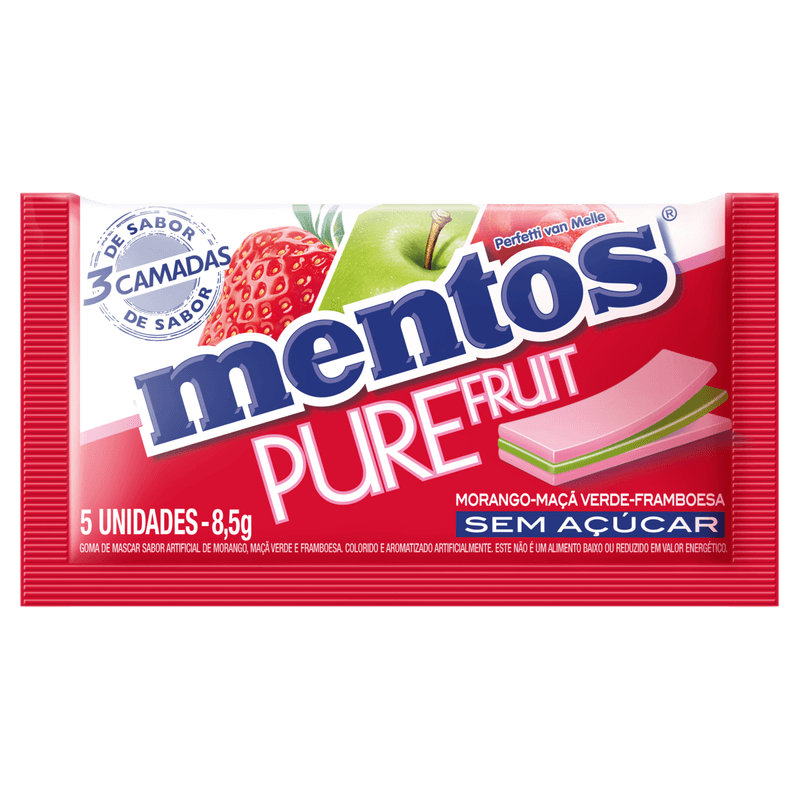 Pack Goma de Mascar Morango, Maçã-Verde e Framboesa Zero Açúcar Mentos Pure Fruit Envelope 127,5g 15 Unidades