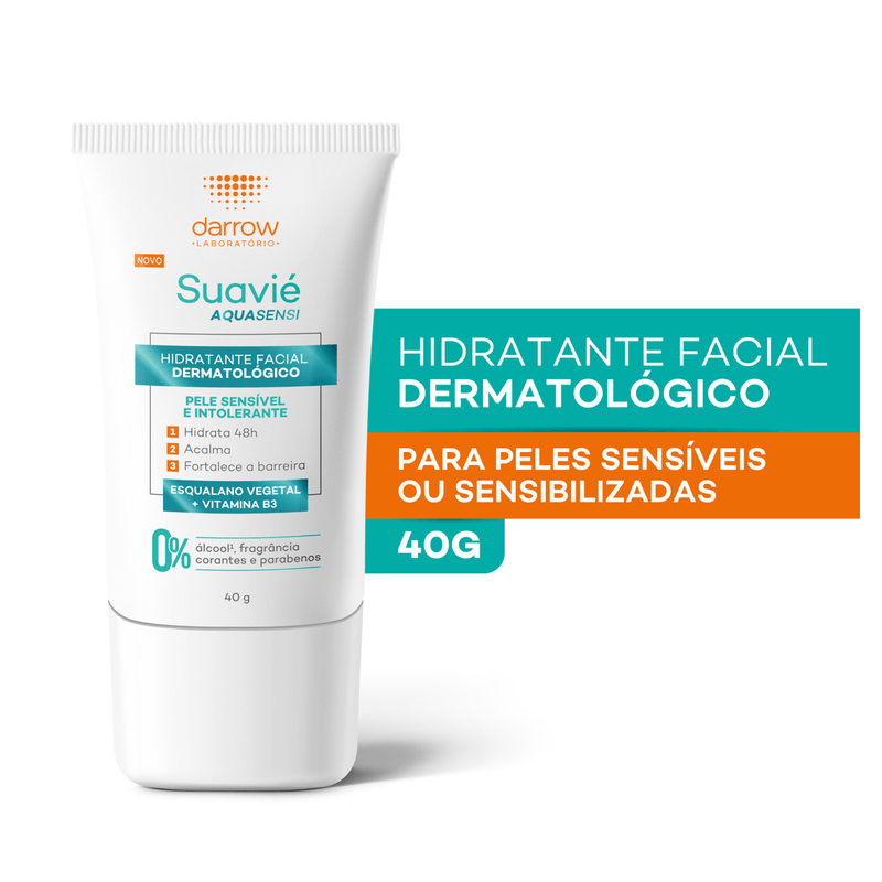O Novo Suavié Aquasensi é um hidratante facial ideal para peles sensíveis ou sensibilizadas. Sua fórmula possui uma combinação exclusiva de ativos calmantes (Esqualano Vegetal, Vitamina B3 e Alfa Bisabolol), é vegana, cruelty free e possui 98% de ingredientes naturais, além de ser livre de álcool*, corantes e parabenos.